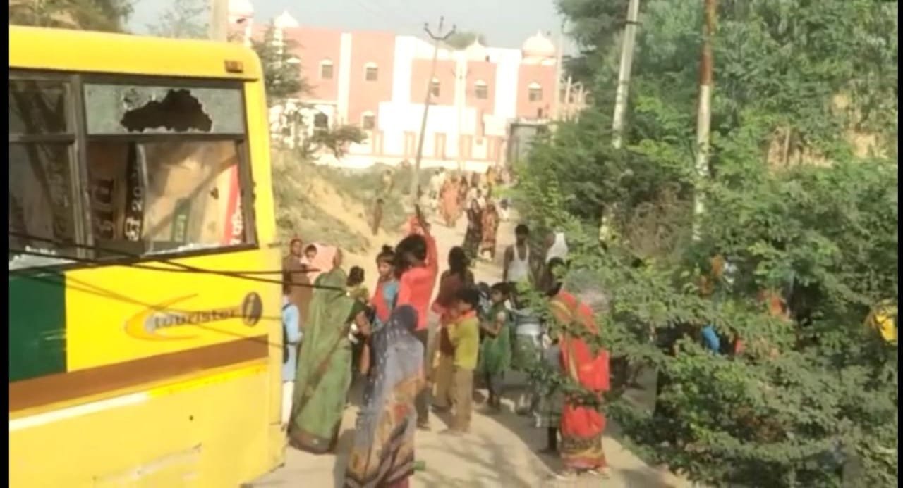 आक्रोशित ग्रामीणों ने स्कूल बस में जमकर किया पथराव व तोड़फोड़