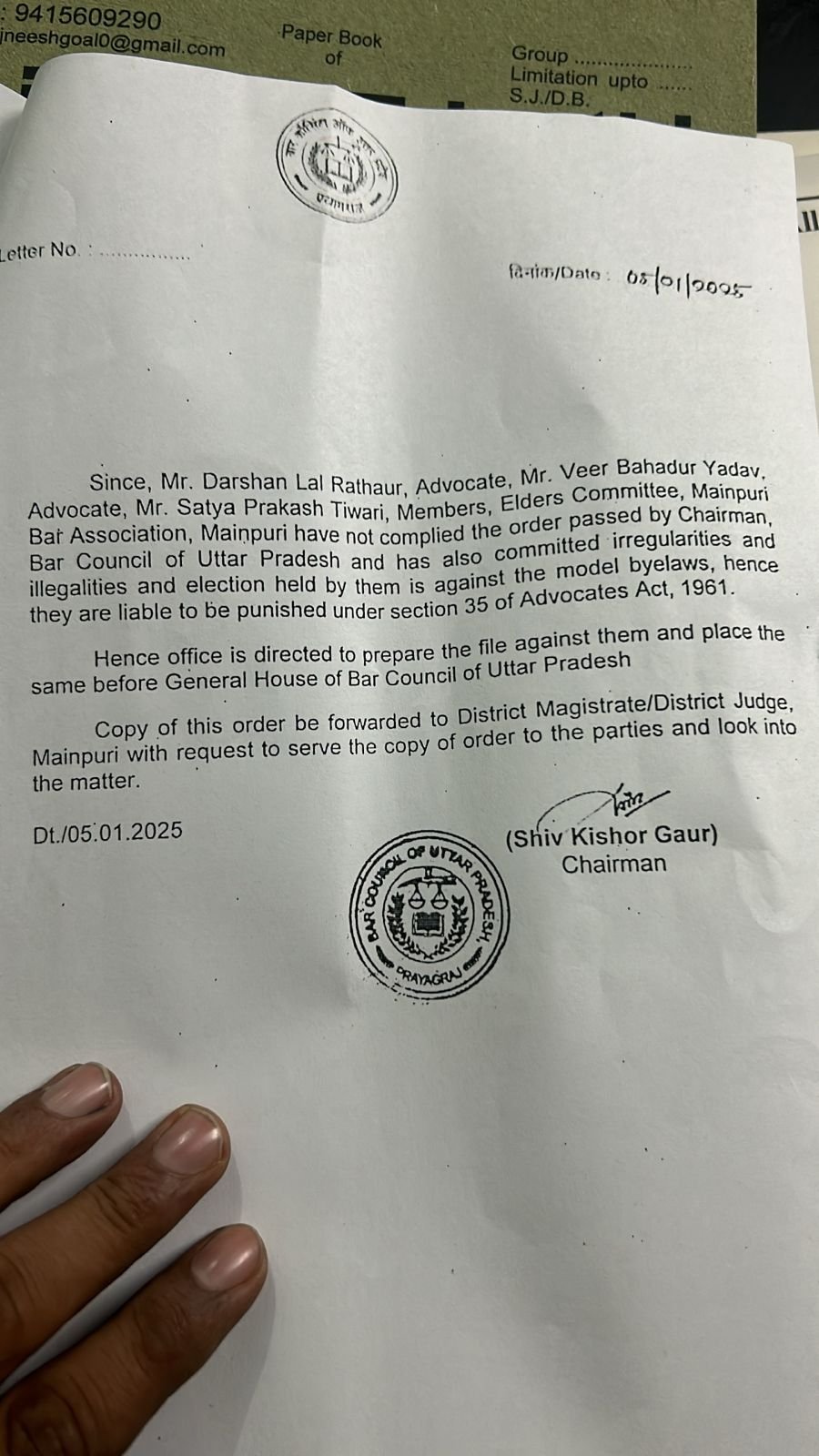 बार कॉउंसिल उत्तर प्रदेश के अध्यक्ष ने कहा अधिवक्ता अधिनियम, 1961 की धारा 35 के तहत दंडित किए जाने के लिए उत्तरदायी हैं।